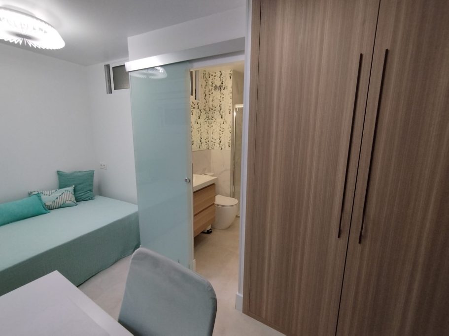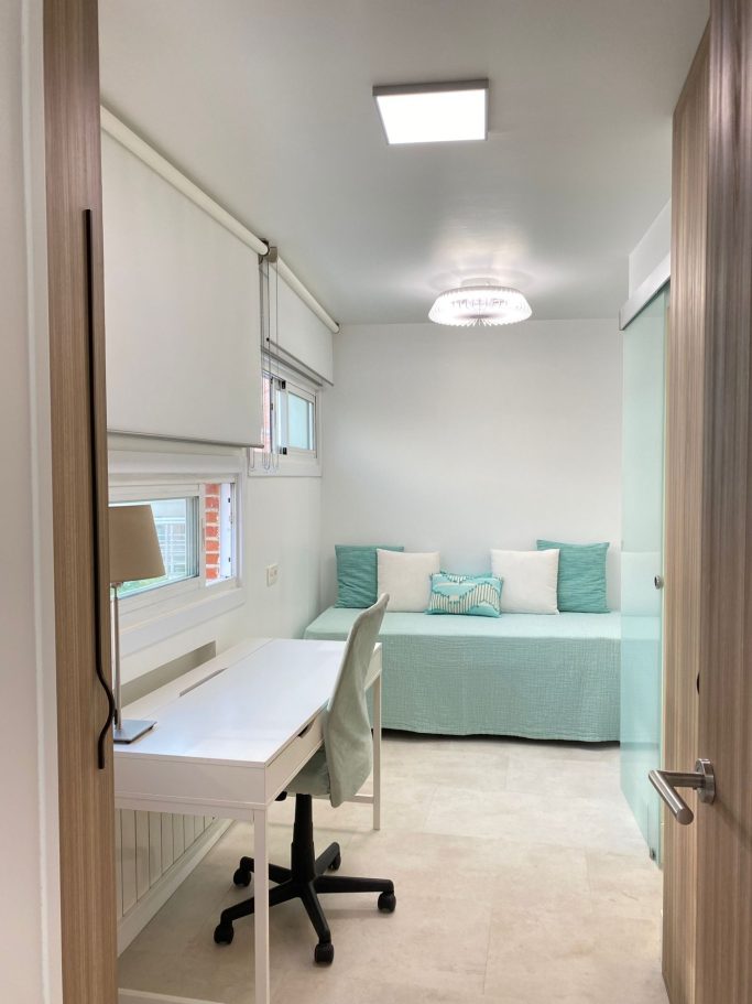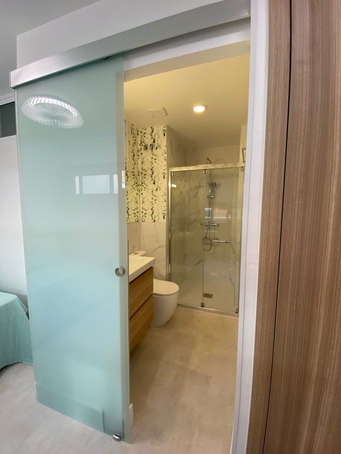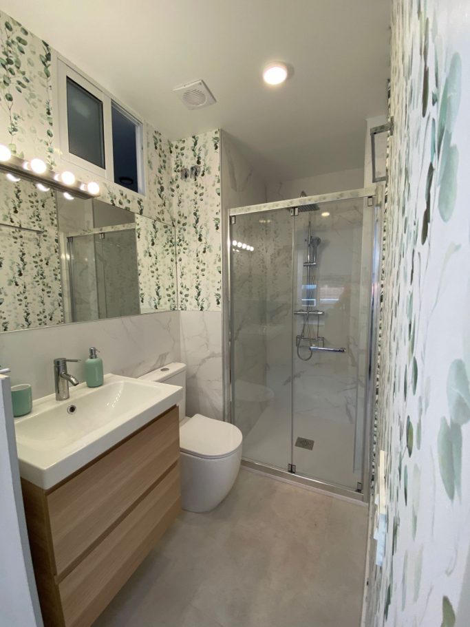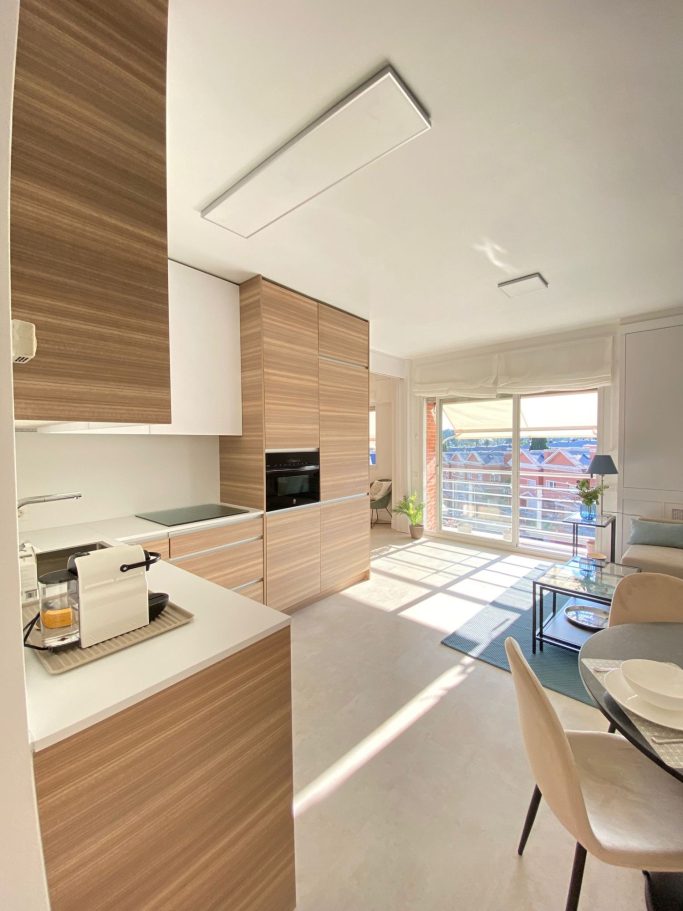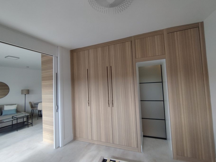 Demolimos el piso entero y lo redistribuimos a dos dormitorios con dos baños ensuite y tres armarios de 2m. y salón con cocina integrada.